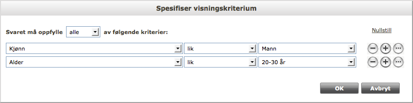 Du bruker pluss/minus-knappen på høyre side for å legge til og fjerne kriterier. Bruk knappen merket "..." til å opprette underkriterier. Pass på å være nøye med å spesifisere om besvarelsene skal oppfylle alle eller noen av kriteriene dine.